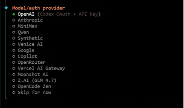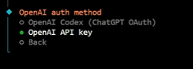 4Escolha o método de autenticação - Por exemplo, se você escolheu OpenAI, selecione OpenAI API Key (chave de acesso ao serviço da OpenAI).